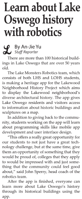 I wrote this article for the Lakeridge Newspacer in 2023. This article is about the robotics team’s app for users to explore Lake Oswego’s history.